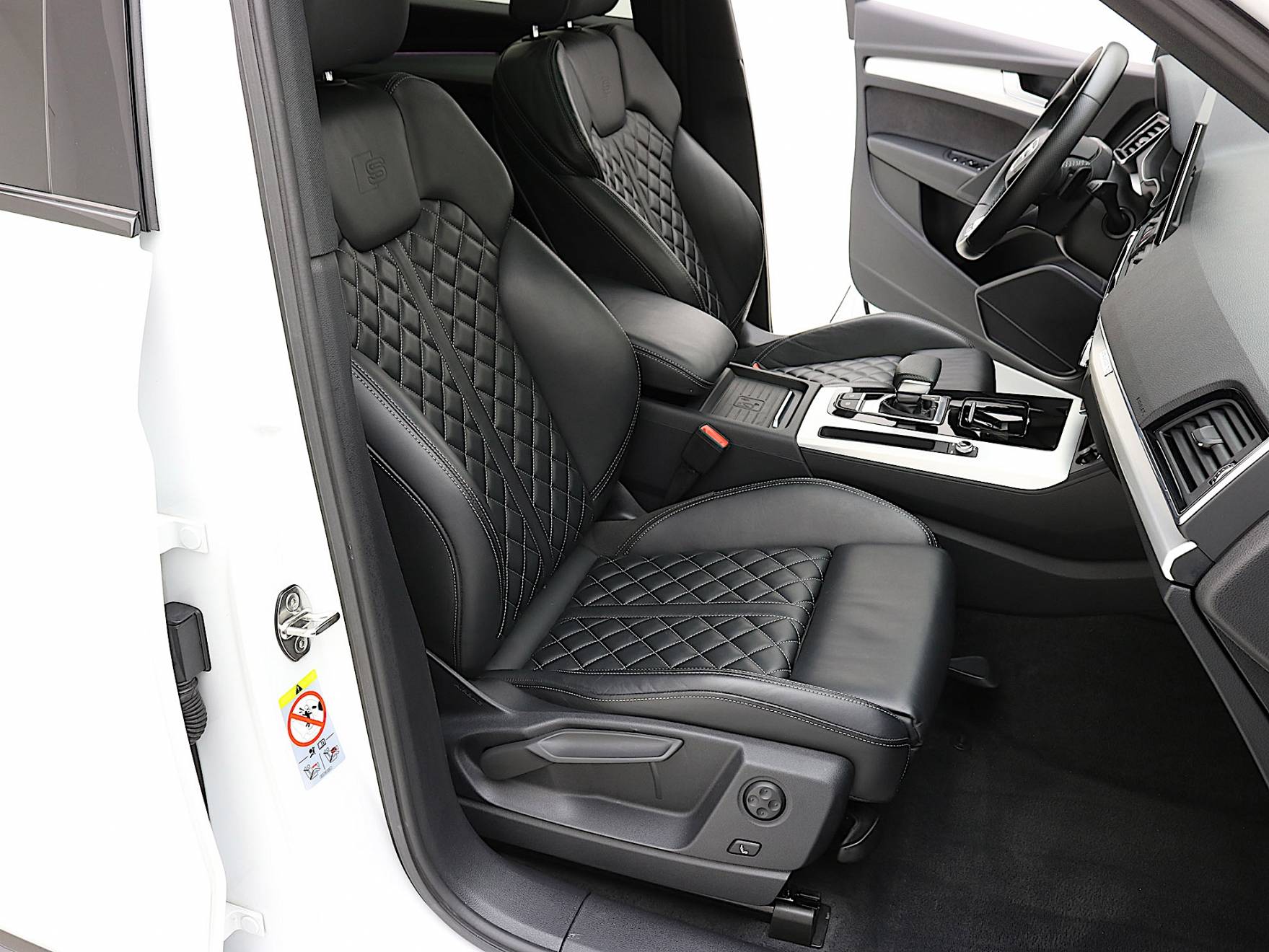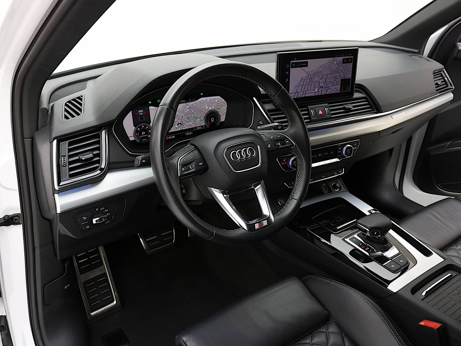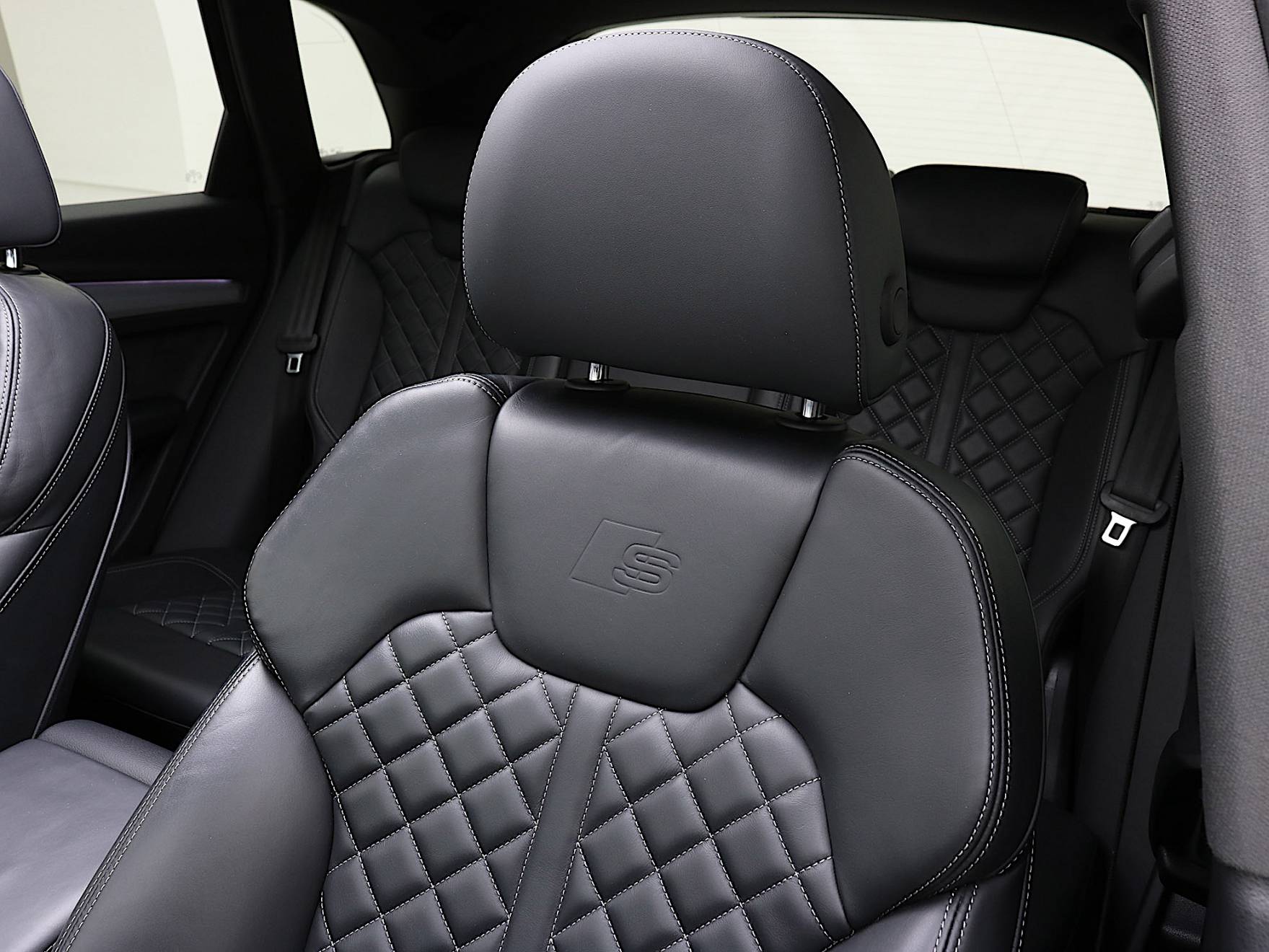✔️ Sedili Rivestiti in Pelle Nappa Fine Nera per Sedili Sportivi con Logo S: Fascia centrale dei sedili, Fianchetti dei sedili, Appoggiatesta e appoggiabraccia centrale in Pelle Nappa con Cuciture a contrasto, Impuntura a "Losanghe" e Logo S sugli schienali dei sedili anteriori.